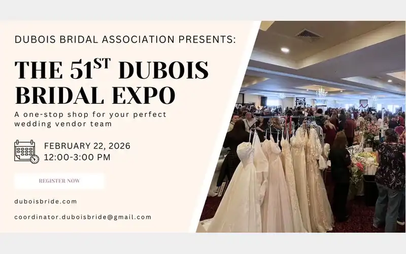 Join us for the 2025 Annual DuBois Bridal Expo on Sunday February 22nd at at the Dubois Country Club from 12-3pm.
