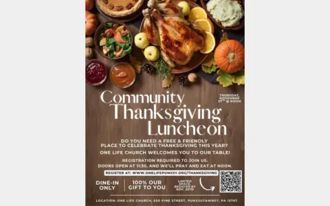 HomeEventsCommunity Thanksgiving Luncheon Community Thanksgiving Luncheon SHARE NOW Thu, Nov 27 from 11:30am to 1:30pm One Life Church500 Pine Street, Punxsy,PA Map Add to My Calendar