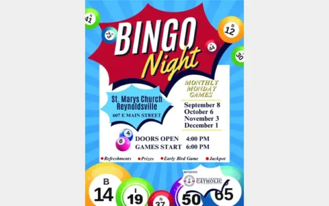 St. Marys Church, 607 E Main Street, Reynoldsville is hosting monthly Monday Bingo Nights to benefit DuBois Central Catholic School. Bingo nights are scheduled for September 8, October 6, November 3 and December 1. Doors open at 4 pm, games begin at 6 pm. There will be an early bird game and a special jackpot in addition to the regular games. Visit www.duboiscatholic.com or contact the school for more information.