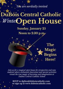 Sunday, January 25, from 12 – 2:30 pm, DuBois Central Catholic Winter Open House. Location: 200 Central Christian Road, DuBois, PA.