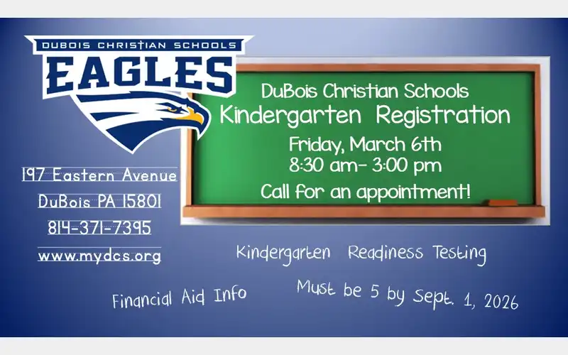 HomeEventsDuBois Christian Schools Kindergarten Registration DuBois Christian Schools Kindergarten Registration SHARE NOW Fri, Mar 6 from 8:30am to 3:00pm DuBois Christian School Add to My Calendar