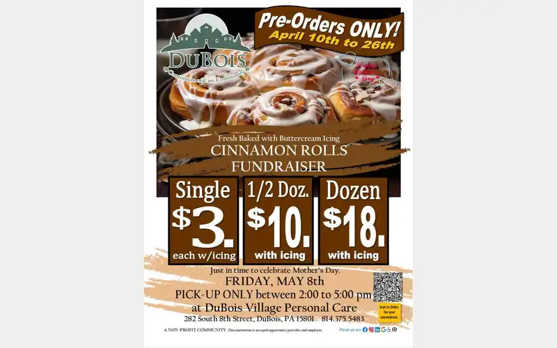 DuBois Continuum of Care Community is hosting a Cinnamon Rolls Fundraiser. Orders can be placed now through April 26th.