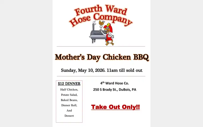 HomeEventsFourth Ward Hose Co. Mother’s Day Chicken BBQ Fourth Ward Hose Co. Mother’s Day Chicken BBQ SHARE NOW Sun, May 10 from 11:00am to 1:00pm Fourth Ward Hose Co.Brady Street, DuBois, PA Map Add to My Calendar