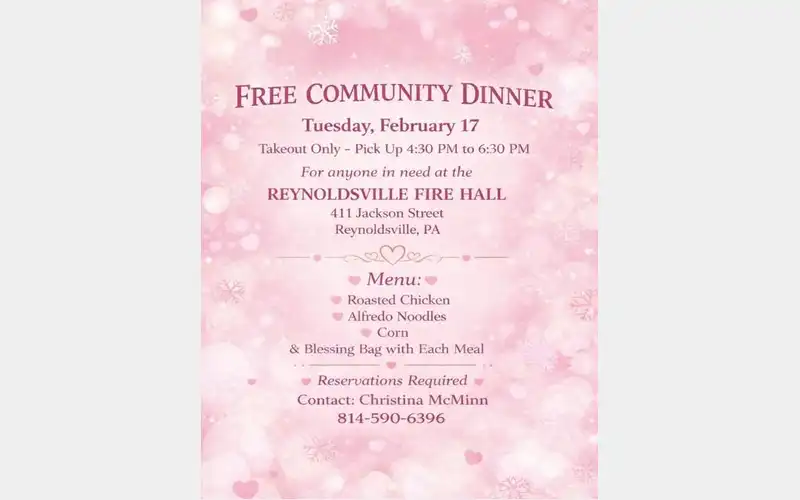 HomeEventsFree Community Meal Free Community Meal SHARE NOW Tue, Feb 17 from 4:30pm to 6:30pm Reynoldsville Fire Hall Add to My Calendar