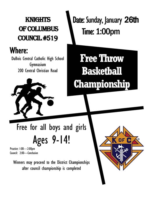 Knights of Columbus Council #516 will be holding a Free Throw Basketball Championship for girls & boys ages 9-14 yrs.