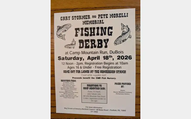 HomeEventsGary Stormer and Pete Morelli Memorial Fishing Derby Gary Stormer and Pete Morelli Memorial Fishing Derby SHARE NOW Sat, Apr 11 from 10:00am to 2:00pm Camp Mountain Run Add to My Calendar