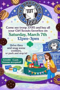 HomeEventsGirl Scout Cookie Drive-Thru with Troop 37015! Girl Scout Cookie Drive-Thru with Troop 37015! SHARE NOW Sat, Mar 7 from 12:00pm to 3:00pm Two Brothers Tees501 Liberty Blvd, DuBois, PA 15801 Map Add to My Calendar