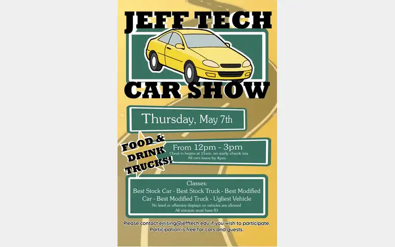 HomeEventsJeff Tech Car Show Jeff Tech Car Show SHARE NOW Thu, May 7 from 12:00pm to 3:00pm Jeff Tech Add to My Calendar