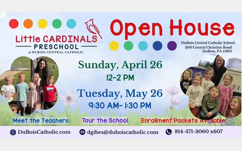 HomeEventsLittle Cardinals Preschool Open House Little Cardinals Preschool Open House SHARE NOW Sun, Apr 26 from 9:30am to 1:30pm DuBois Central Catholic School Central Christian Road Add to My Calendar