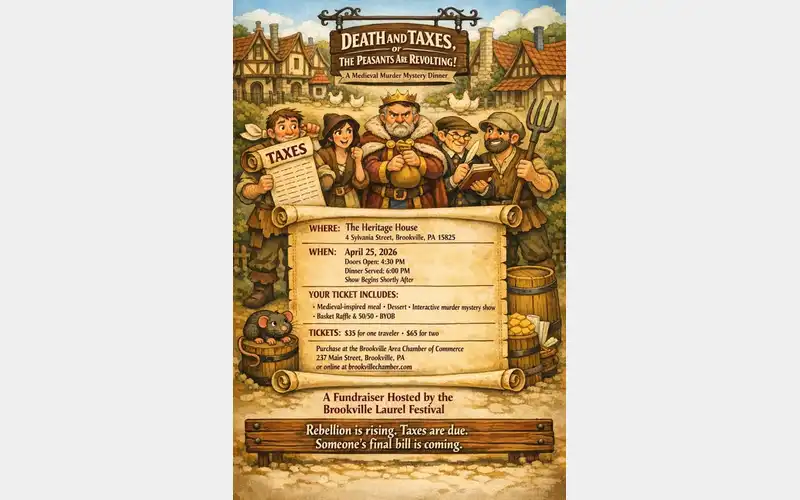 The Brookville Laurel Festival Committee is turning up the excitement with its upcoming Murder Mystery ‘Dinner, Death and Taxes – The Peasants Are Revolting’, set for Saturday, April 25, 2026 at The Heritage House.