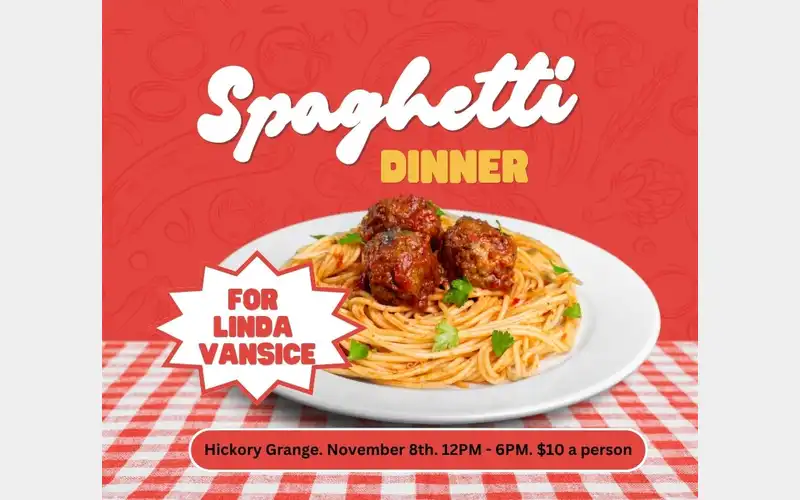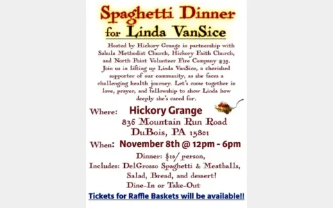 HomeEventsSpaghetti Dinner Spaghetti Dinner SHARE NOW Sat, Nov 8 from 12:00pm to 8:00pm Hickory GrangeMountain Run Road, DuBois, PA Map Add to My Calendar