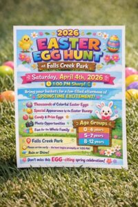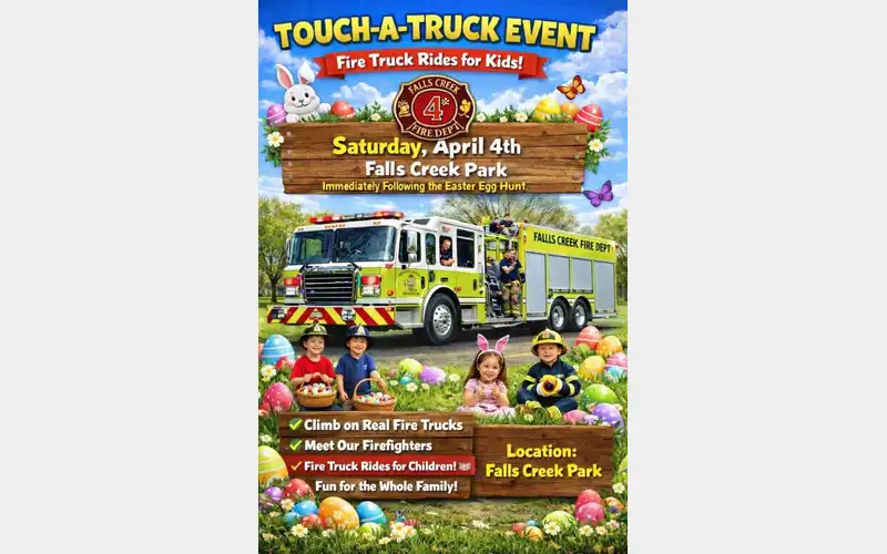 We will be hosting a touch a truck event including gifts and fire truck rides for the kids following the Easter Egg Hunt at the Falls Creek Park Saturday April 4th!