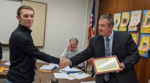Photo: Senior Anthony Glasl accepts a plaque from Superintendent Jeff Vizza.