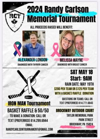 The benefit roller hockey tournament will start at 9 at the outdoor rink at Taylor Park in Brockway.