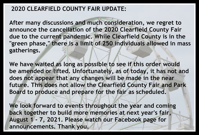 Clearfield, PA – The 160th Clearfield County Fair that was originally scheduled for Aug. 2 through 8 has now officially been canceled because of COVID-19 safety concerns and regulations.