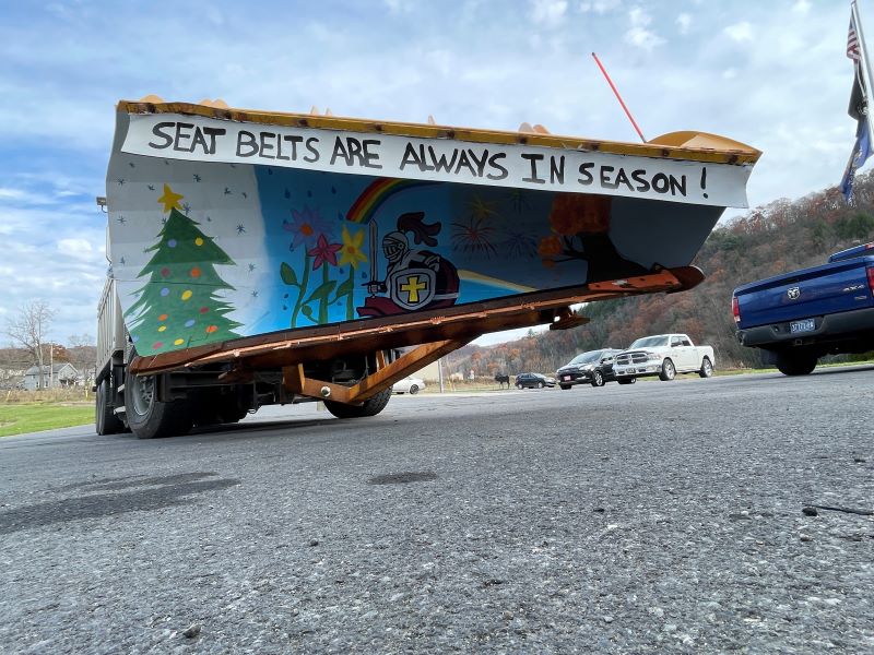 The Elk County Catholic High School plow depicts their mascot buckled up with winter, spring, summer and fall imagery to convey this year’s theme of “Seat belts are always in season.”