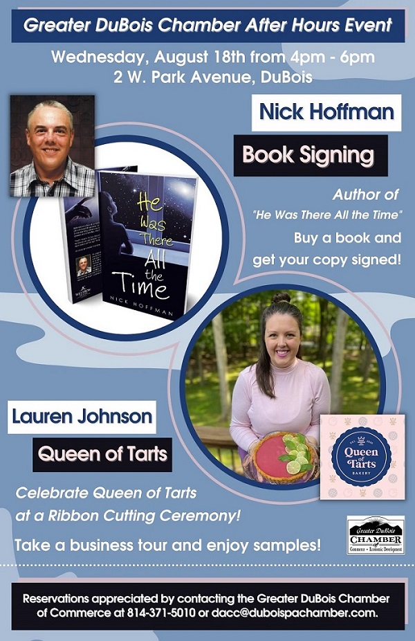 DuBois, PA – Enjoy a Chamber After Hours event today, Aug. 18 with Nick Hoffman, Author of “He Was There All The Time” and newest DuBois Chamber member, Queen of Tarts.