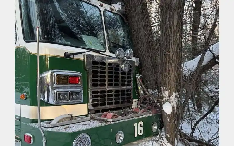 At around 7:15am Thursday morning, fire crews with the BJW Volunteer Fire Company were traveling to a reported house fire in Bradford Township when the fire engine slid off of the roadway striking a tree.