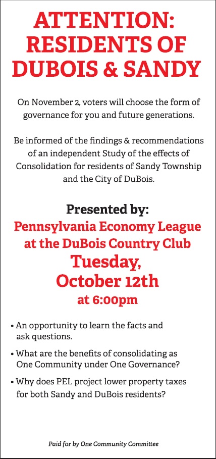 The PEL says this is an opportunity to learn facts and ask questions, talk about the benefits of consolidating as one community under one governance, and how the PEL project could lower taxes for both City of DuBois and Sandy Township residents.